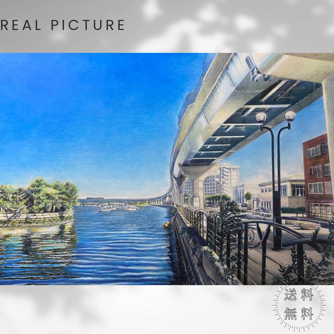 金沢八景駅シーサイドラインの橋下からの景色を色鉛筆5色で描きました。